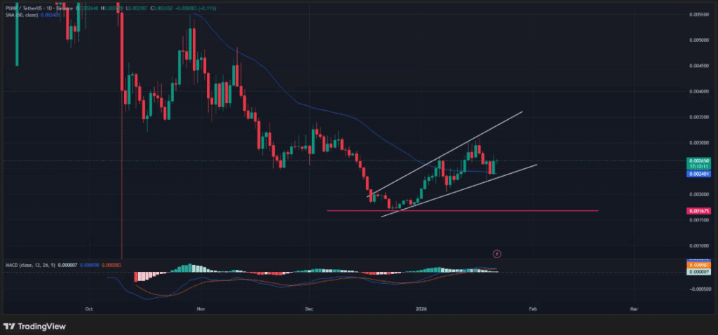 除了鲸鱼活动的转变,技术分析也指出Pump.fun面临进一步的下行风险。日线图正在形成上升扩大楔形形态,这种模式通常与波动性加剧和潜在的看跌反转相关。该形态的特征是价格在两条发散的趋势线内创出更高的高点和更高的低点,表明若价格跌破关键支撑位,可能出现即将到来的破位。