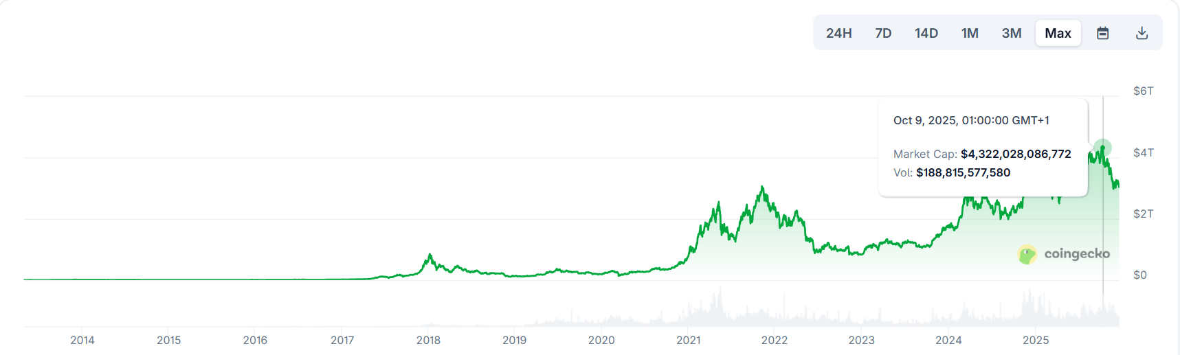 总市值是衡量行业变迁的最佳风向标。在2024年末ETF获批、散户回归与机构资金涌入推动的暴涨之后,市场进入了分析师所谓的"常态化阶段"。2025年初总市值曾短暂突破4万亿美元大关