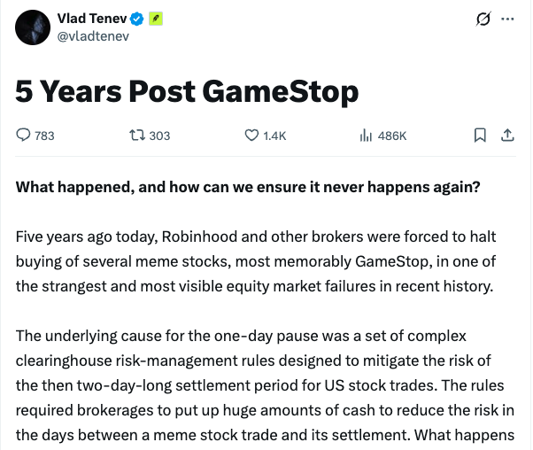特涅夫周三在社交平台X发文表示,2021年游戏驿站交易冻结事件是“近年来最奇特且最引人注目的股市失灵案例”,其根源在于当时基于两日股票结算周期衍生的复杂规则体系。