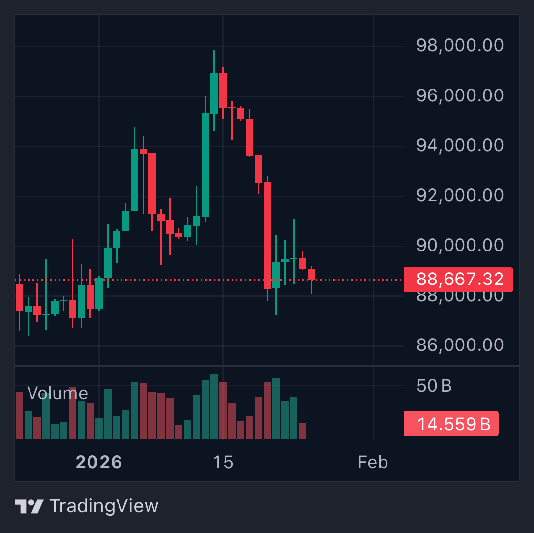 尽管抛售压力持续上升,根据TradingView数据,比特币当前交易价格约为88646美元,过去24小时内跌幅为0.83%。