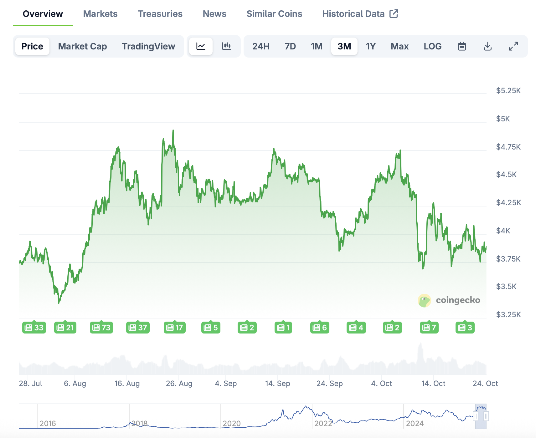 关口。他对质疑者的回应是:"以太坊远未消亡"。截至10月23日,ETH交易价约3880美元,在三季度暴涨创历史新高后进入盘整。资金正从比特币流向山寨币、DeFi协议及新一波代币化资产。