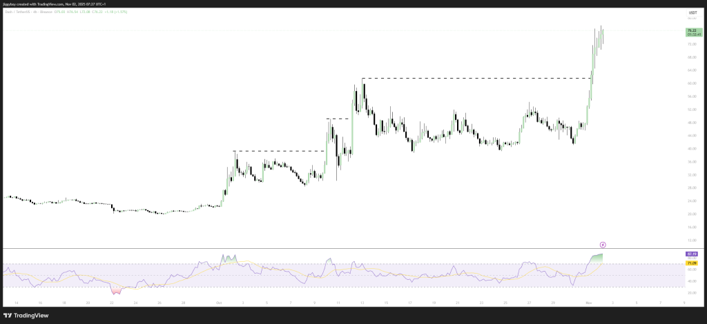 4小时图呈现明显的多阶段突破,价格先后攻克44美元、55美元和64美元阻力位,加速突破72美元后创下当前高点。突破性蜡烛形态表明动量买家强势入场。DASH价格现已站上76美元且几乎没有回调,显示出长期筑底后的强劲延续走势。