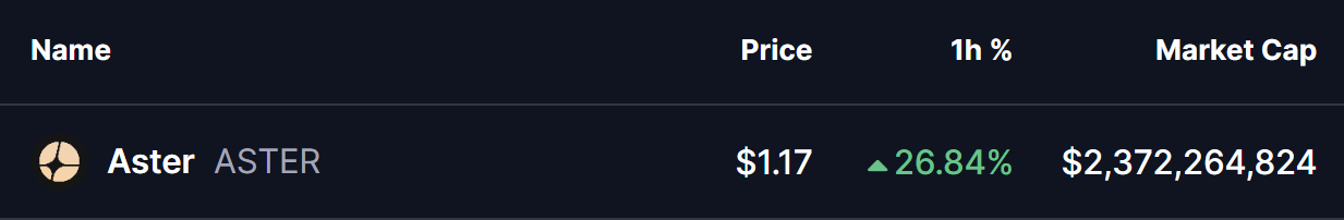 去中心化交易所代币Aster(ASTER)一小时暴涨26%