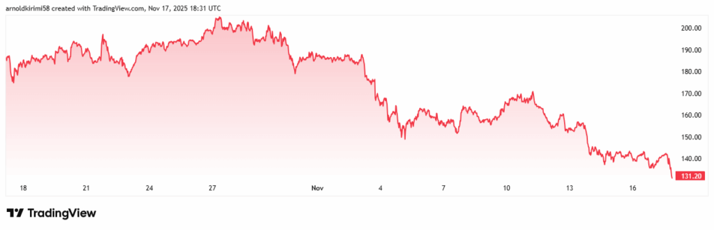 TradingView数据显示,截至11月18日SOL价格约135美元,较一个月前下跌27%。该代币在2025年1月触及294美元峰值后持续修正,分析师认为130-140美元区间为关键支撑位。