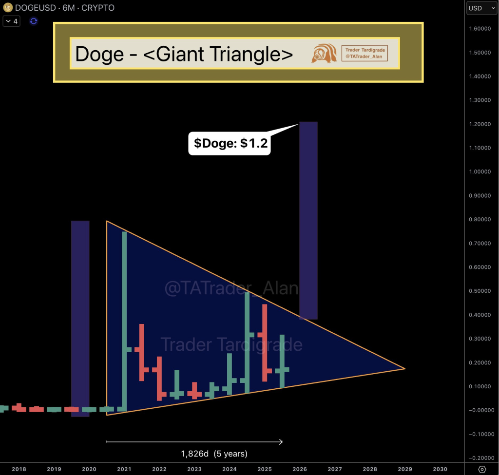 过去五年间,狗狗币形成的巨型三角形态预示着重大突破即将来临。分析师指出,这种技术形态可能推动价格攀升至1.2美元。类似形态曾在2017年和2021年的大幅上涨行情中出现,当时狗狗币价格均实现惊人涨幅。
