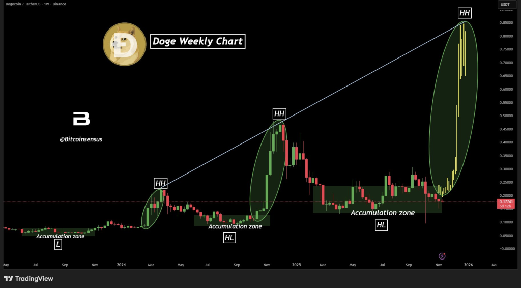 狗狗币目前正处于盘整阶段,这与过往牛市启动前的状况相似。该代币交易正处于新一轮周线吸筹区间,投资者可能正在为下一波行情布局。这种盘整阶段往往是价格飙升的前兆。