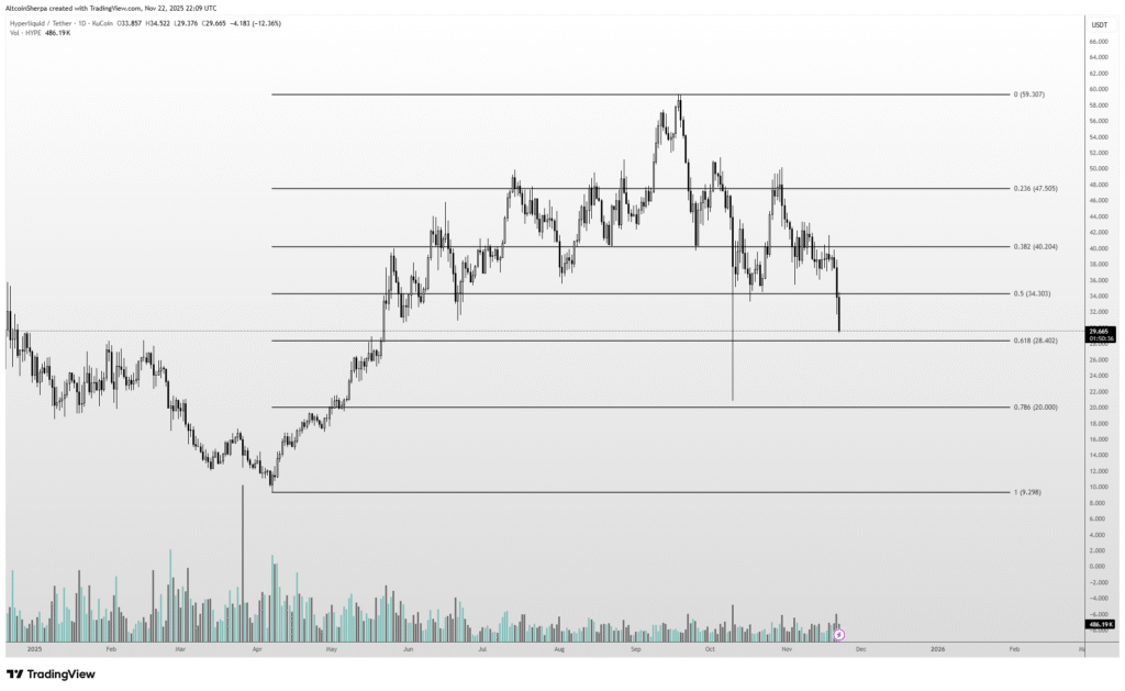 在跌破关键技术位后,HYPE代币面临日益增加的抛售压力。交易者正密切关注斐波那契回撤区域,特别是34美元附近的0.618水平。Altcoin Sherpa最新分析指出该代币已跌破主要支撑位,并警告可能进一步下跌。此次价格回调发生在此前高点之后——HYPE曾在2025年9月达到59.39美元的高点。