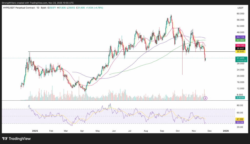 自2024年11月Hyperliquid空投以来,早期支持者已获得超3亿枚代币,当时市场估值约12亿美元。HYPE以3.20美元开盘后快速攀升,吸引了机构和散户投资者的关注。StrongHedge对HYPE展开技术复盘,指出在近期急跌后曾反弹至31.40美元,涨幅达4.76%,但价格仍低于前历史高点——这一位置通常被视为关键支撑转阻力位。