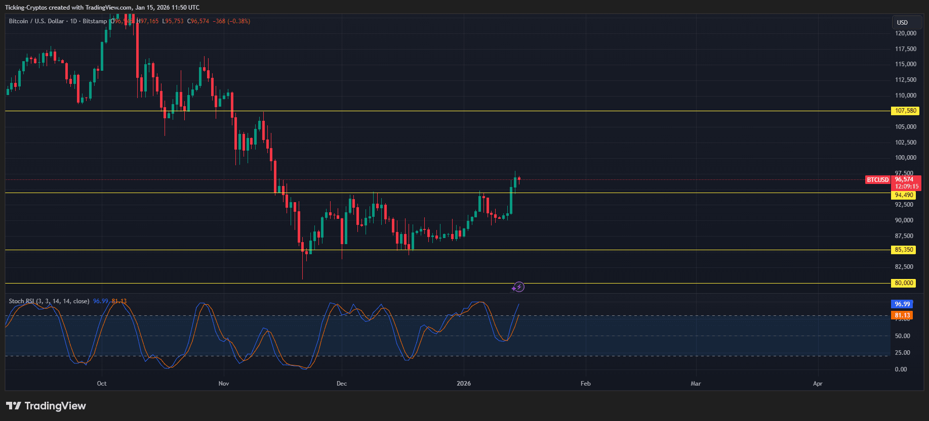 相较于传统市场,比特币的价格走势目前展现出极强动能。经过一段盘整期后,BTC/USD已重新站上96,000美元关口,标志着多头取得重大心理胜利。