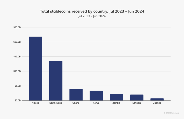 各国稳定币接收量(2023年7月-2024年6月)。数据来源:Chainalysis
