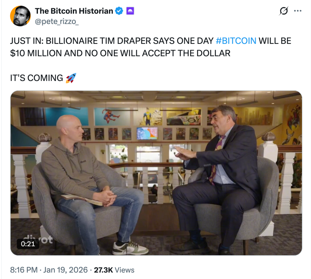 德雷珀将比特币描述为一个长期的采用故事,其固定供应量和不断扩大的全球使用范围为其提供支持。他补充说,如果每枚比特币价格达到1000万美元,美元可能将失去其作为可用货币的角色。