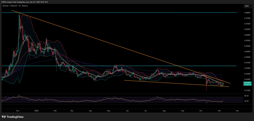 尽管当前反弹态势良好,但市场更关注$VET是否具备重返0.1美元峰值的潜力。加密货币分析师@TheCryptoYapper在2025年11月7日的推文中指出:"周线支撑目前保持完好,唯链能否突破0.1美元仍待观察。"