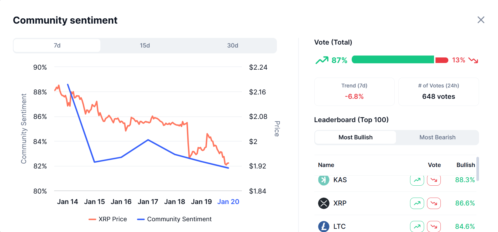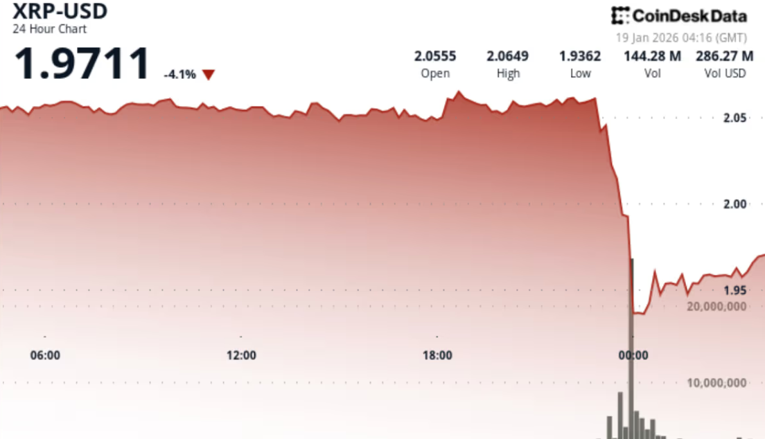 XRP/USD货币对单日下跌13%,在测试1.84美元低点后收于1.97美元附近。恐慌情绪来袭,交易量激增189%,由于格陵兰问题引发的新关税威胁以及对前总统特朗普与美联储关系的质疑,爆仓持续累积。此次回调抹去了1月初2.17美元峰值带来的涨幅,使市场对下一步走势产生分歧。关于埃隆·马斯克在X支付中增加XRP的传言增添了炒作素材,但宏观层面的担忧主导了在线讨论。