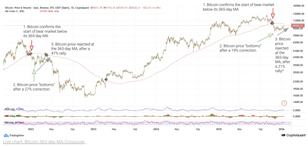 根据CryptoQuant图表显示,比特币价格正逐渐接近365日移动平均线。这条长期趋势线在2022年熊市中曾起到决定性作用——当时它扮演着阻力位的角色:比特币短暂反弹后未能有效突破该均线,随即转入更深幅度的下跌。正因如此,交易者们当前正密切关注该区域动向。