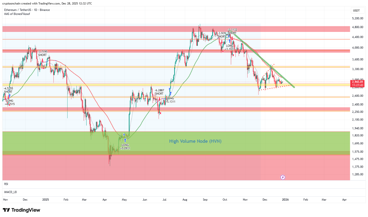 以太坊目前在一个明确的范围内交易,上方以下降趋势线为界,下方以2800美元附近的水平支撑为界。