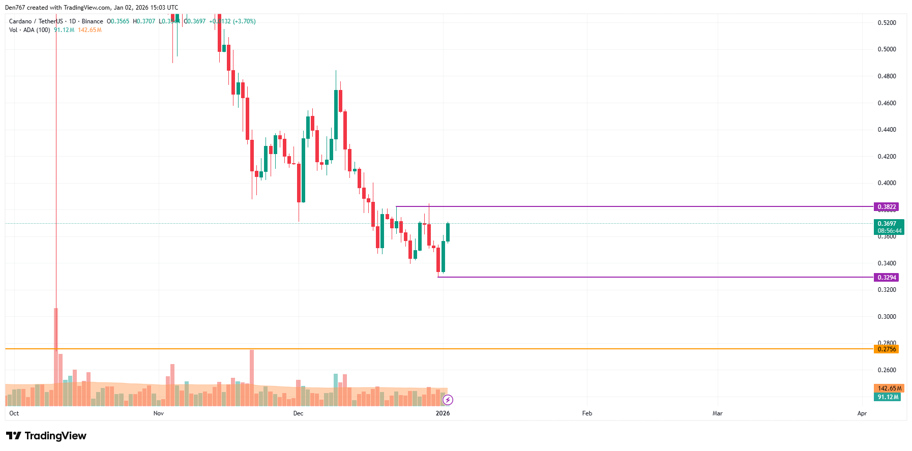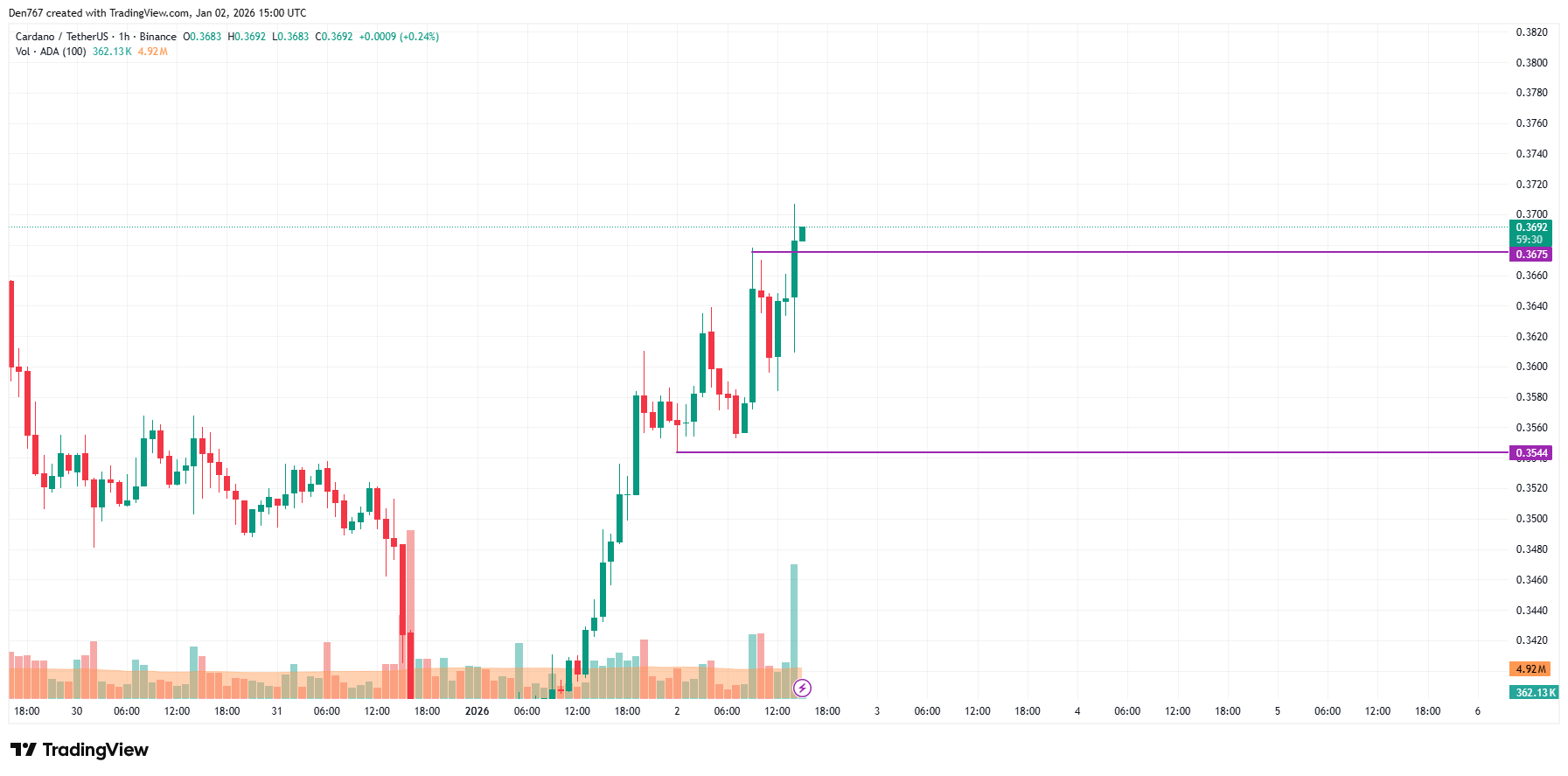 ADA价格已突破0.3675美元的本土阻力位。若多头能维持当前势头,周末有望继续上攻至0.38美元区间。