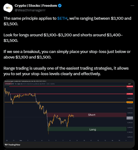 "Crypto Stocks Freedom"提供的图表显示,3,100至3,200美元附近存在多头兴趣,而3,400至3,500美元接近以太坊价格阻力位,空头兴趣浓厚。这种策略依赖明确的止损指令来规避区间突破风险。