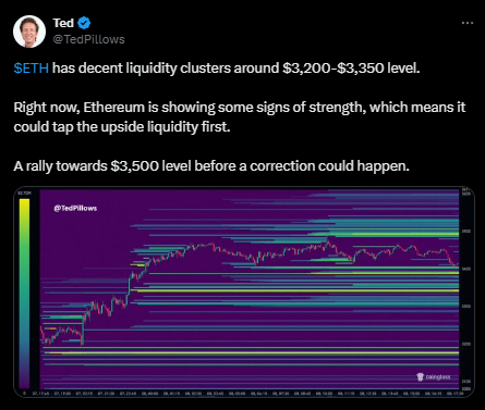 分析师Ted Pillows指出,近期以太坊价格在3,200至3,350美元附近形成流动性集群。这些集群代表着大量待执行的限价单,价格往往会测试这些区域。Pillows认为当前市场强度暗示价格可能先上探高位,再出现回调。