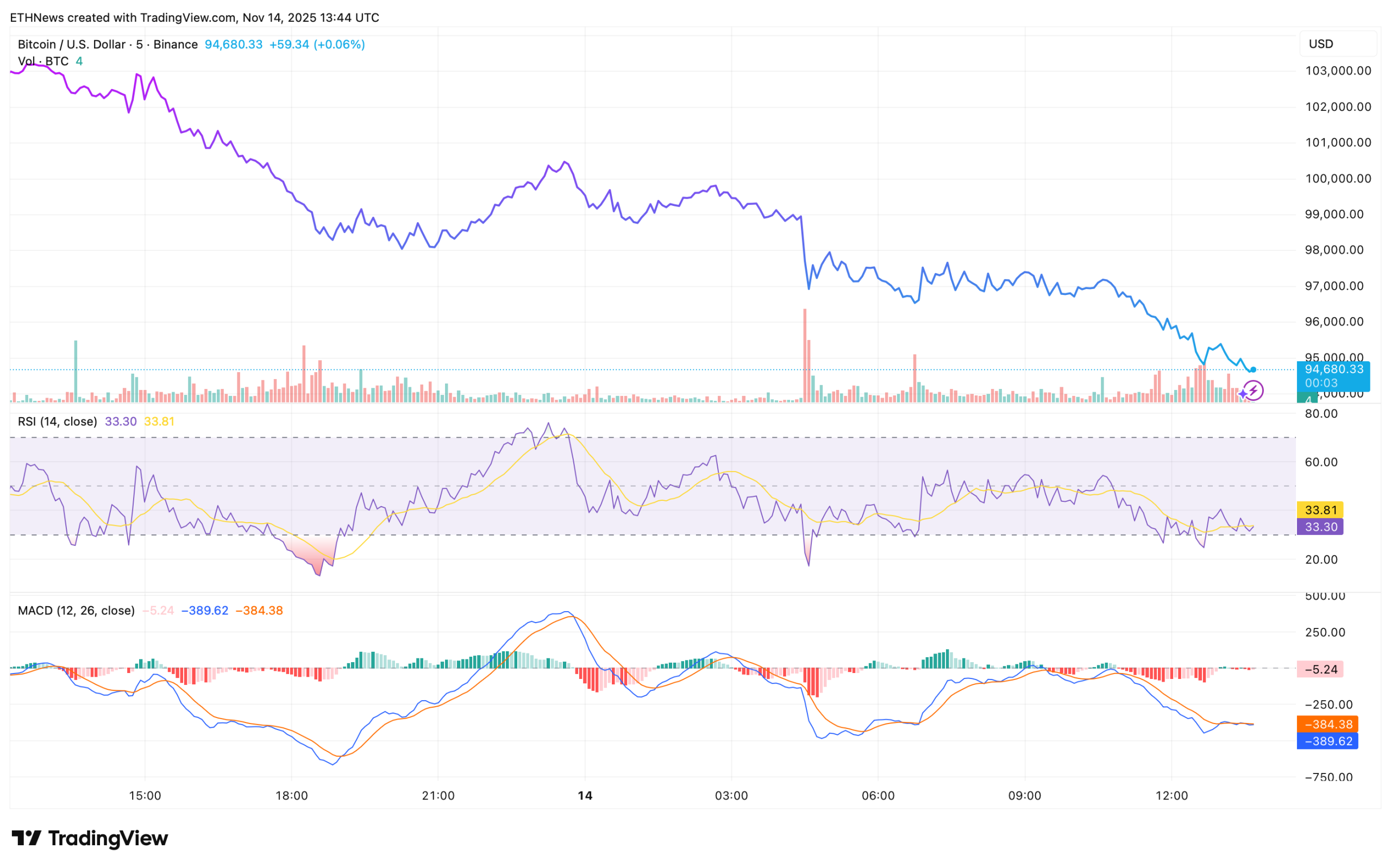 随着抛压加剧,比特币24小时内跌幅超7%,跌至94,600美元。ETF资金流出飙升至8.67亿美元,创2025年2月以来最大单日赎回纪录。长期持有者在30天内抛售81.5万枚BTC(价值790亿美元),这一重大抛售行为导致市场结构趋于疲软。当前RSI指标为33.30,MACD呈现看跌信号,显示下行趋势尚未出现明显逆转。