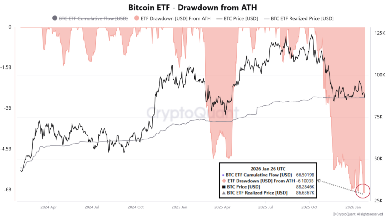 链上分析平台CryptoQuant周三发布的新研究显示,比特币ETF买家正艰难维持市场持仓。自2025年10月净持仓达到726亿美元的历史峰值以来,美国现货比特币ETF已遭遇超60亿美元资金流出。而当时BTC价格正触及126,200美元的历史高位,随后的下跌严重打击了机构投资者的热情。