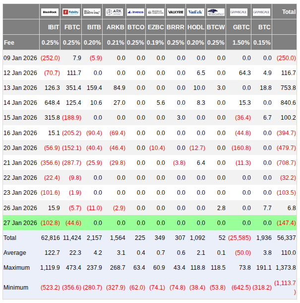 一月中旬以来ETF资金流向持续承压。英国投资公司Farside Investors最新数据显示,自1月16日起资金呈现净流出态势。仅1月26日实现净流入,且总额仅680万美元,同时仍有三个ETF产品遭遇资金流失。