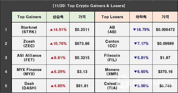 11月20日加密货币行情:比特币微涨0.09%,STRK飙升14.91%,AB暴跌18.79%
