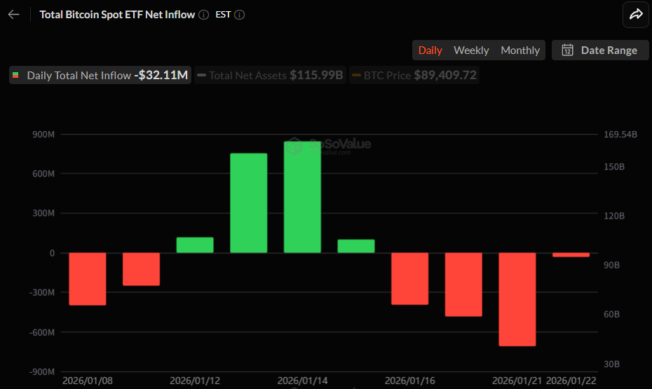 美国比特币现货ETF市场出现单日小幅资金外流。据最新数据显示,截至1月22日(当地时间),美国比特币现货ETF市场录得3211万美元的单日净流出。虽然流出幅度已显著放缓,但自16日以来,截至该日已连续四个交易日呈现短期调整趋势。累计净流入规模小幅减少至566亿美元2026-01-23